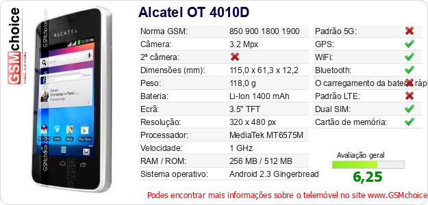 Dados sobre o telemóvel Alcatel OT 4010D na sua página