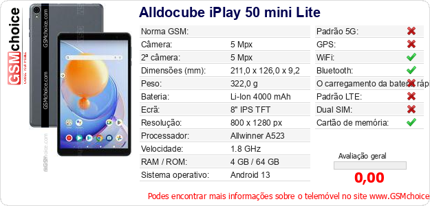 Dados sobre o telemóvel Alldocube iPlay 50 mini Lite na sua página