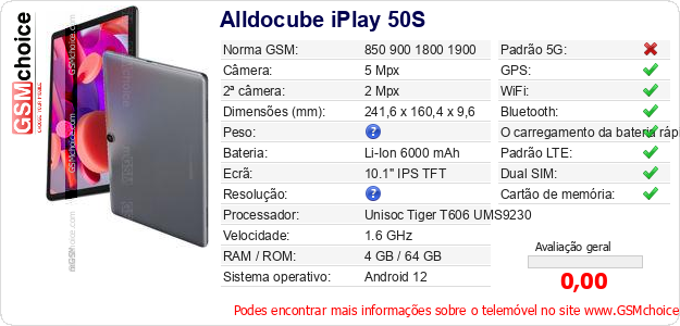 Dados sobre o telemóvel Alldocube iPlay 50S na sua página