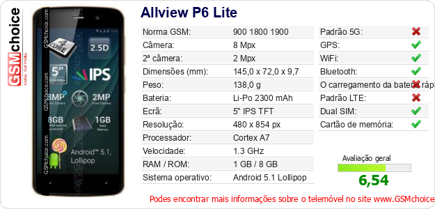 Dados sobre o telemóvel Allview P6 Lite na sua página