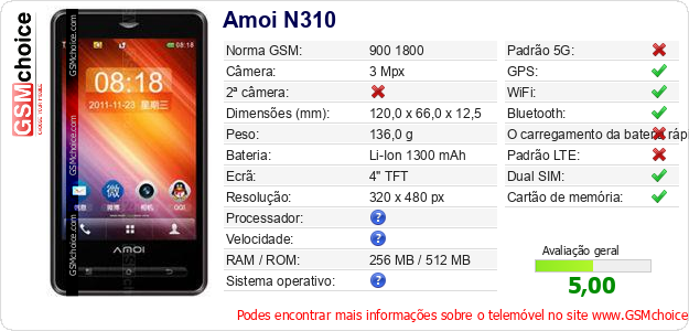 Dados sobre o telemóvel Amoi N310 na sua página