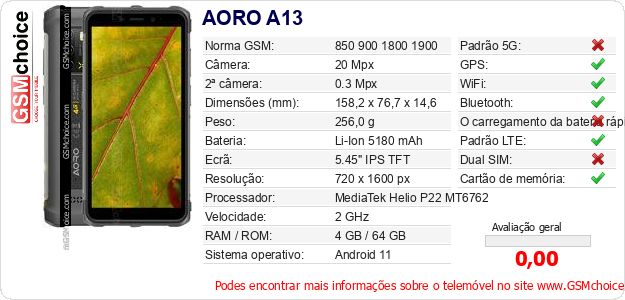 Dados sobre o telemóvel AORO A13 na sua página