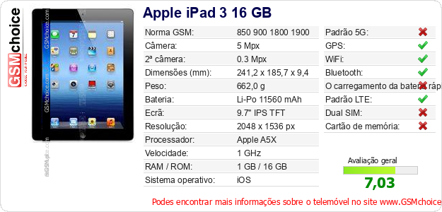 Dados sobre o telemóvel Apple iPad 3 16 GB na sua página