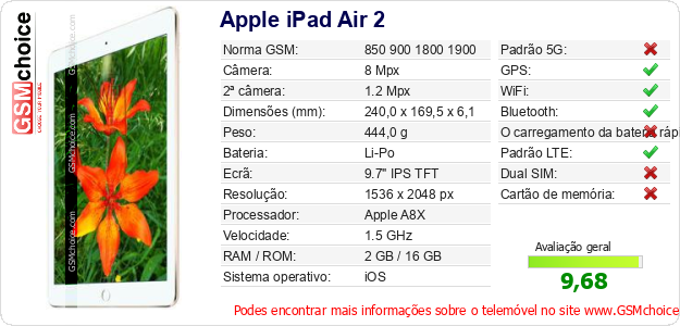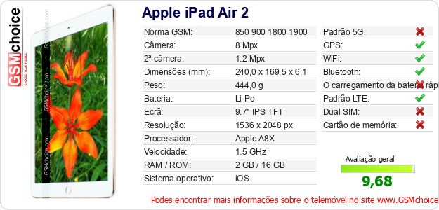 Dados sobre o telemóvel Apple iPad Air 2 na sua página