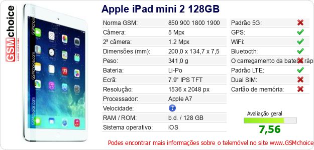 Dados sobre o telemóvel Apple iPad mini 2 128GB na sua página