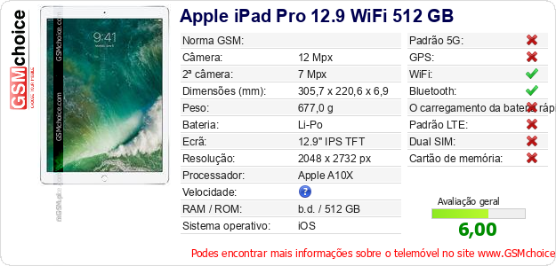 Dados sobre o telemóvel Apple iPad Pro 12.9 WiFi 512 GB na sua página
