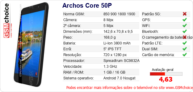 Dados sobre o telemóvel Archos Core 50P na sua página