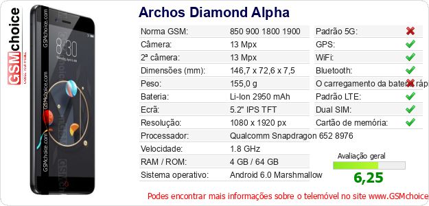 Dados sobre o telemóvel Archos Diamond Alpha na sua página