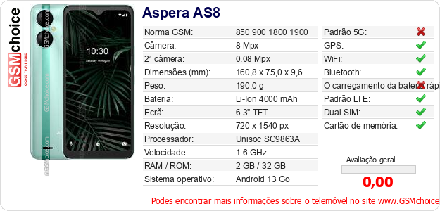 Dados sobre o telemóvel Aspera AS8 na sua página