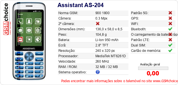 Dados sobre o telemóvel Assistant AS-204 na sua página