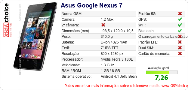 Dados sobre o telemóvel Asus Google Nexus 7 na sua página