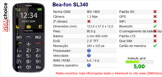 Dados sobre o telemóvel Bea-fon SL340 na sua página