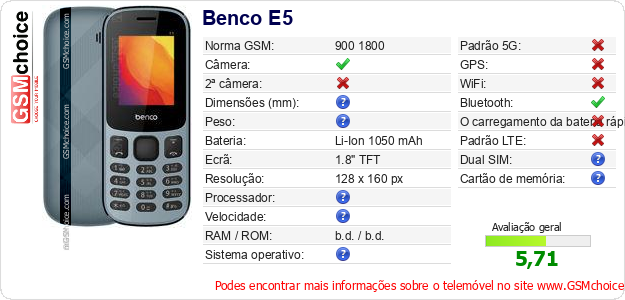 Dados sobre o telemóvel Benco E5 na sua página