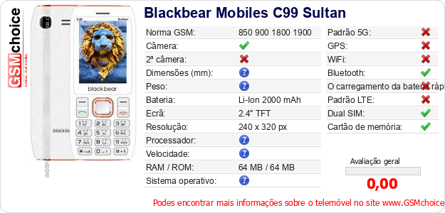 Dados sobre o telemóvel Blackbear Mobiles C99 Sultan na sua página