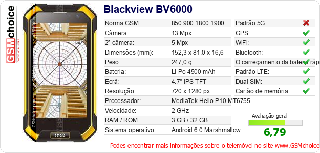Dados sobre o telemóvel Blackview BV6000 na sua página