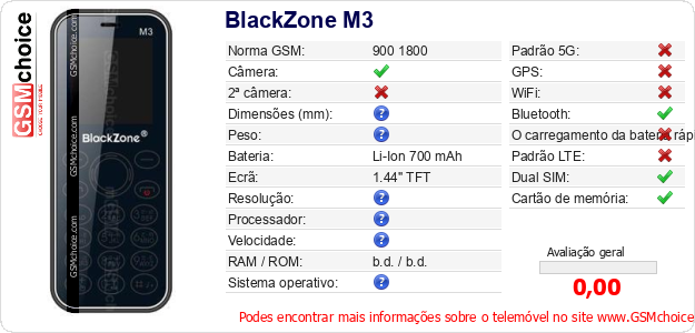 Dados sobre o telemóvel BlackZone M3 na sua página