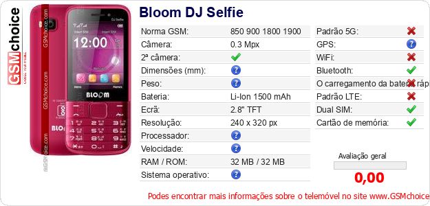 Dados sobre o telemóvel Bloom DJ Selfie na sua página