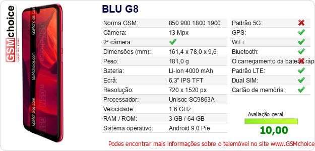 Dados sobre o telemóvel BLU G8 na sua página
