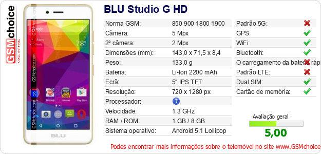 Dados sobre o telemóvel BLU Studio G HD na sua página