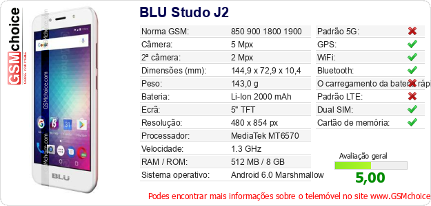 Dados sobre o telemóvel BLU Studo J2 na sua página