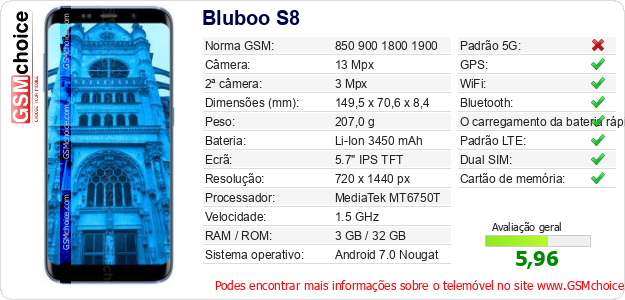 Dados sobre o telemóvel Bluboo S8 na sua página