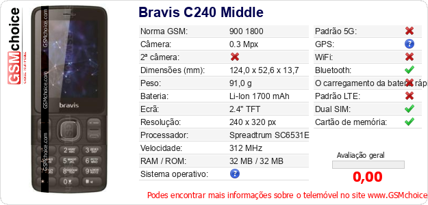 Dados sobre o telemóvel Bravis C240 Middle na sua página