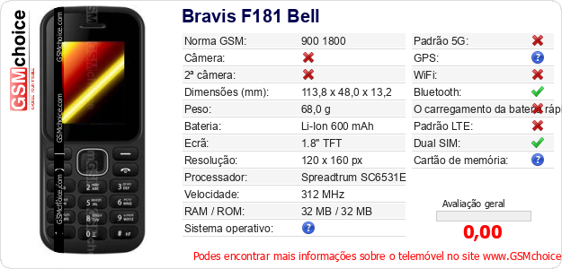 Dados sobre o telemóvel Bravis F181 Bell na sua página