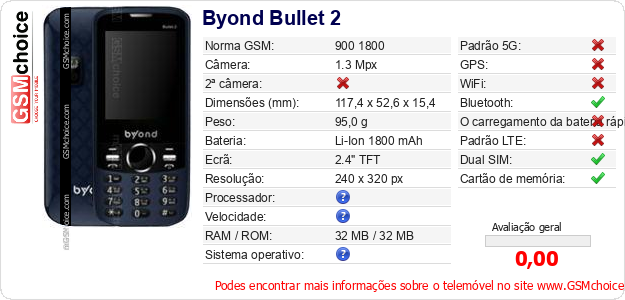 Dados sobre o telemóvel Byond Bullet 2 na sua página