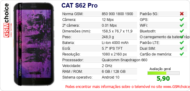 Dados sobre o telemóvel CAT S62 Pro na sua página