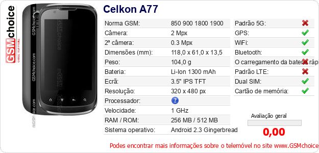 Dados sobre o telemóvel Celkon A77 na sua página