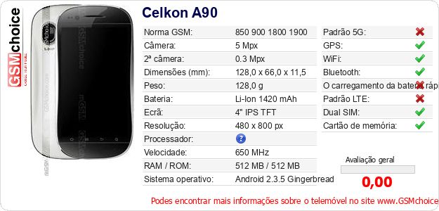Dados sobre o telemóvel Celkon A90 na sua página