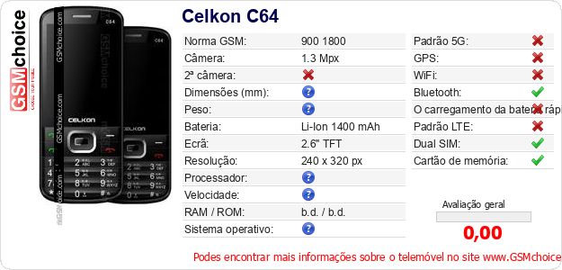 Dados sobre o telemóvel Celkon C64 na sua página