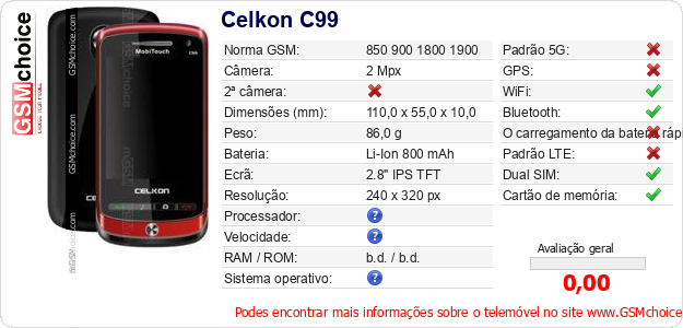 Dados sobre o telemóvel Celkon C99 na sua página