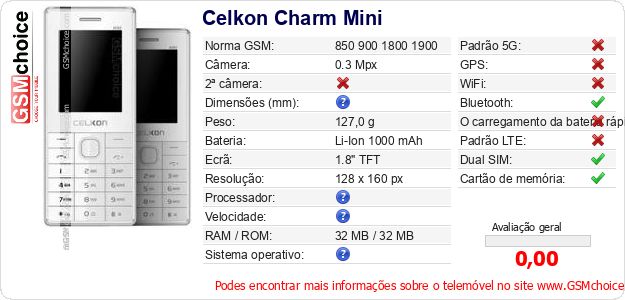 Dados sobre o telemóvel Celkon Charm Mini na sua página