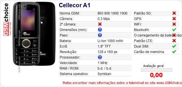 Dados sobre o telemóvel Cellecor A1 na sua página