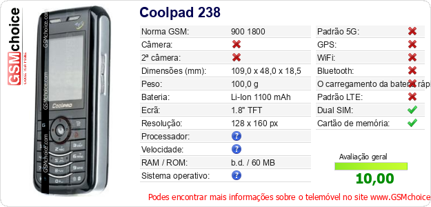 Dados sobre o telemóvel Coolpad 238 na sua página
