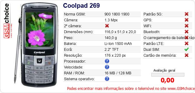 Dados sobre o telemóvel Coolpad 269 na sua página
