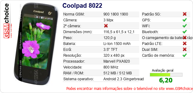 Dados sobre o telemóvel Coolpad 8022 na sua página