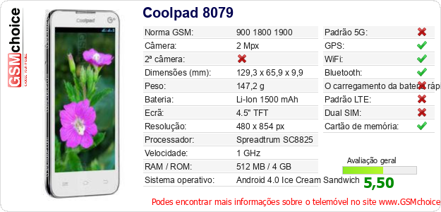 Dados sobre o telemóvel Coolpad 8079 na sua página