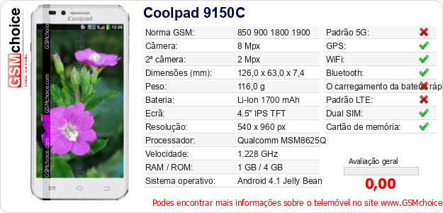Dados sobre o telemóvel Coolpad 9150C na sua página