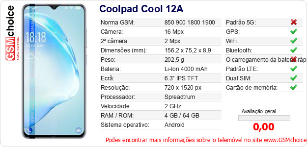 Dados sobre o telemóvel Coolpad Cool 12A na sua página