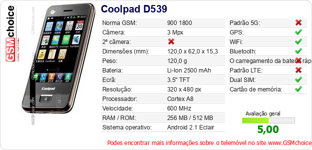 Dados sobre o telemóvel Coolpad D539 na sua página