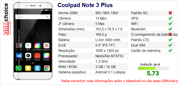 Dados sobre o telemóvel Coolpad Note 3 Plus na sua página