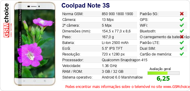 Dados sobre o telemóvel Coolpad Note 3S na sua página