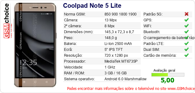 Dados sobre o telemóvel Coolpad Note 5 Lite na sua página
