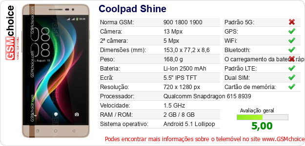 Dados sobre o telemóvel Coolpad Shine na sua página