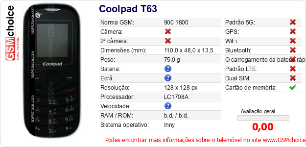Dados sobre o telemóvel Coolpad T63 na sua página