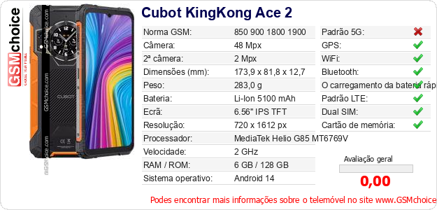 Dados sobre o telemóvel Cubot KingKong Ace 2 na sua página