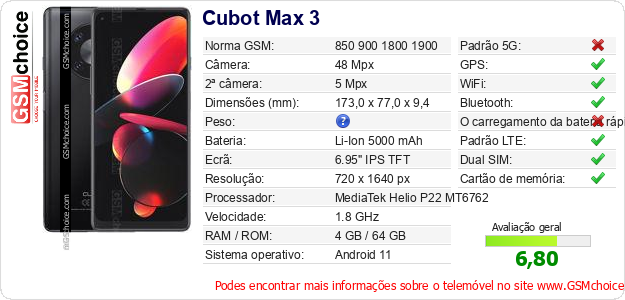 Dados sobre o telemóvel Cubot Max 3 na sua página