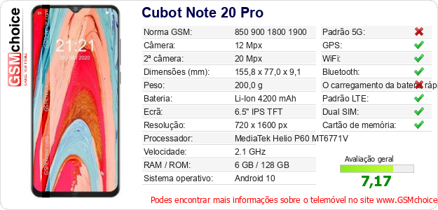 Dados sobre o telemóvel Cubot Note 20 Pro na sua página